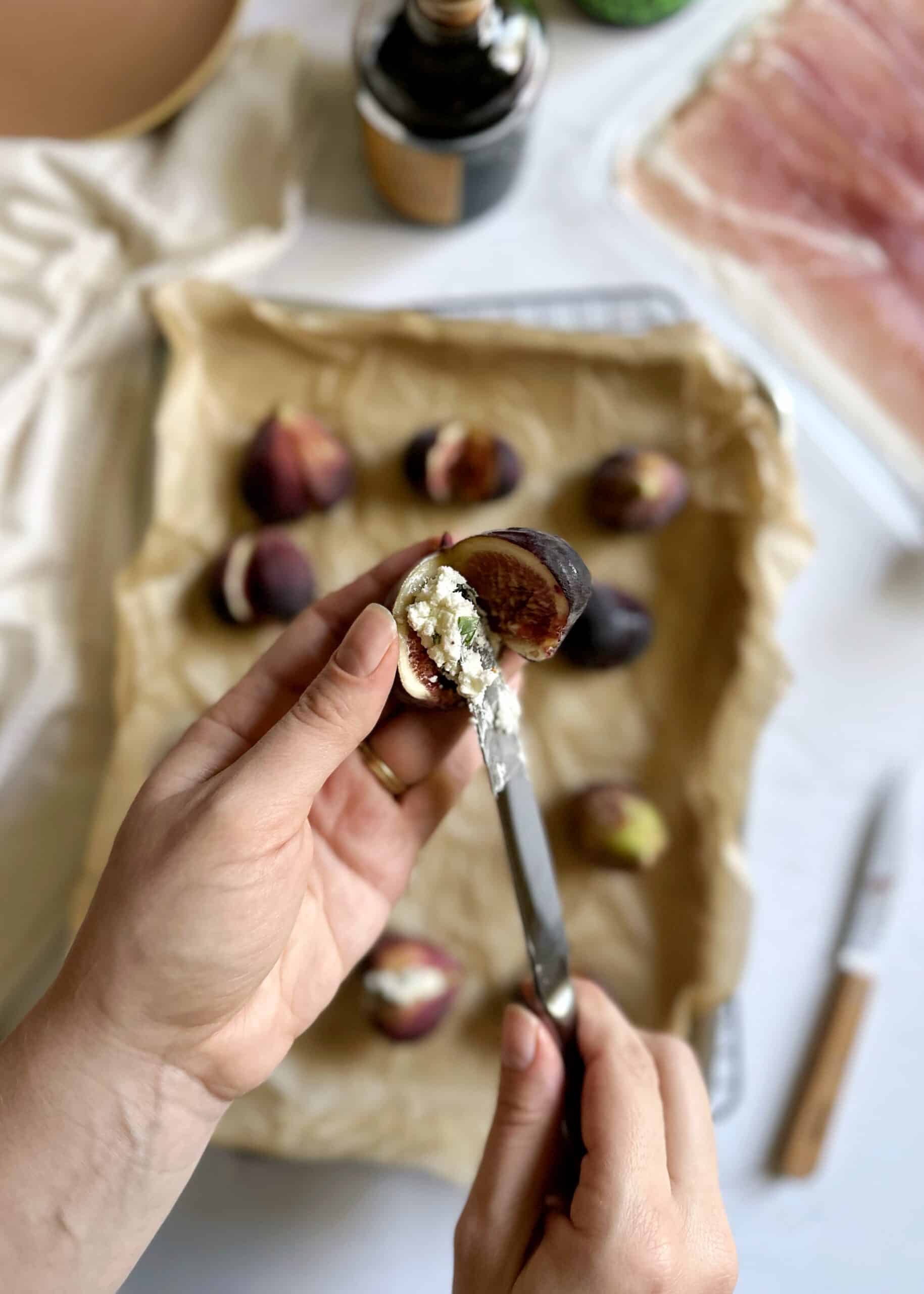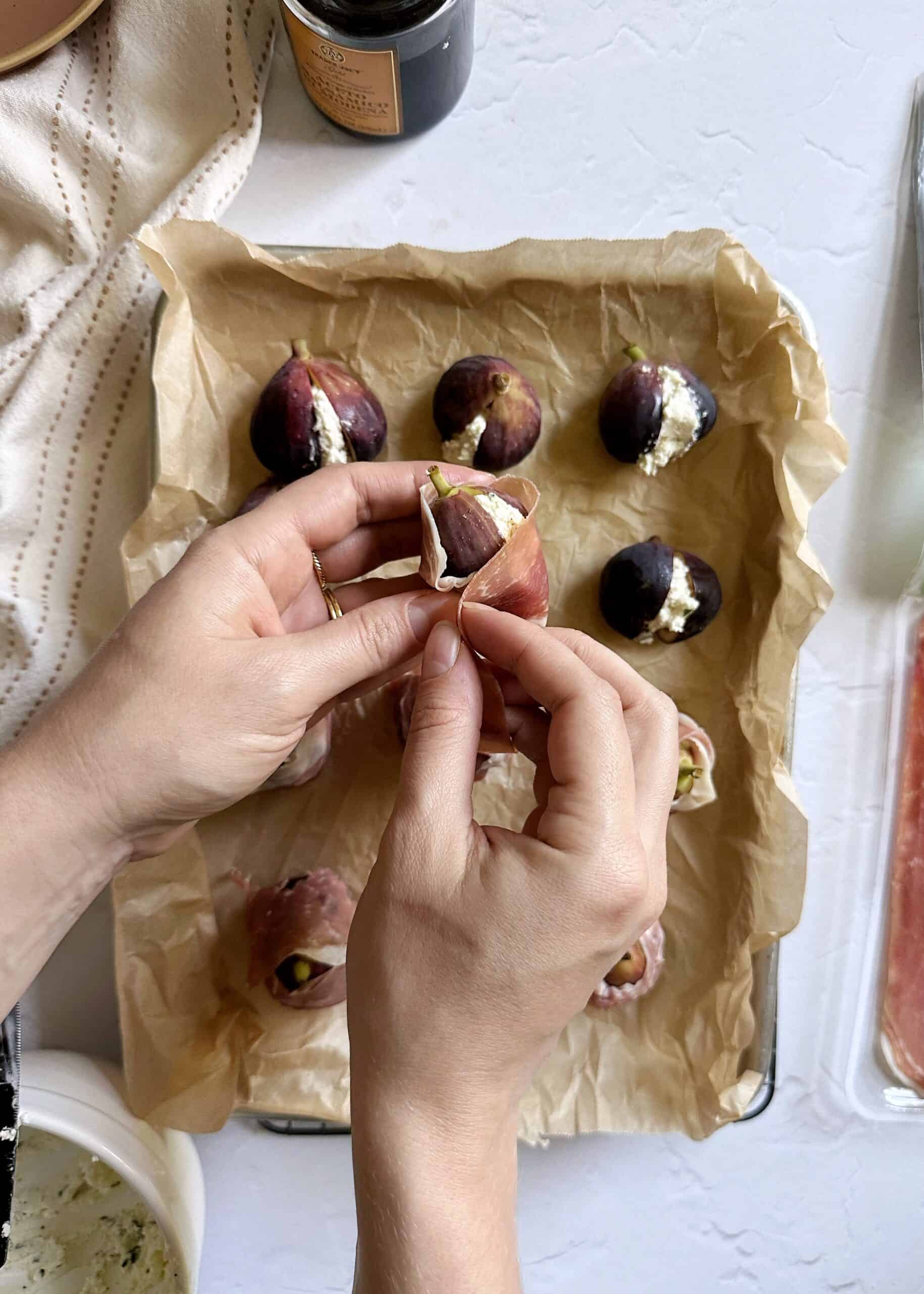 Use a spoon or butter knife to add a dollop of the goat cheese mixture to the center of each sliced fig. Gently squeeze either side of the fig together to secure the goat cheese in place. Wrap each fig with a strip of prosciutto around the entire fruit, taking care to cover the bottom of the fruit to keep the goat cheese in place while it bakes.