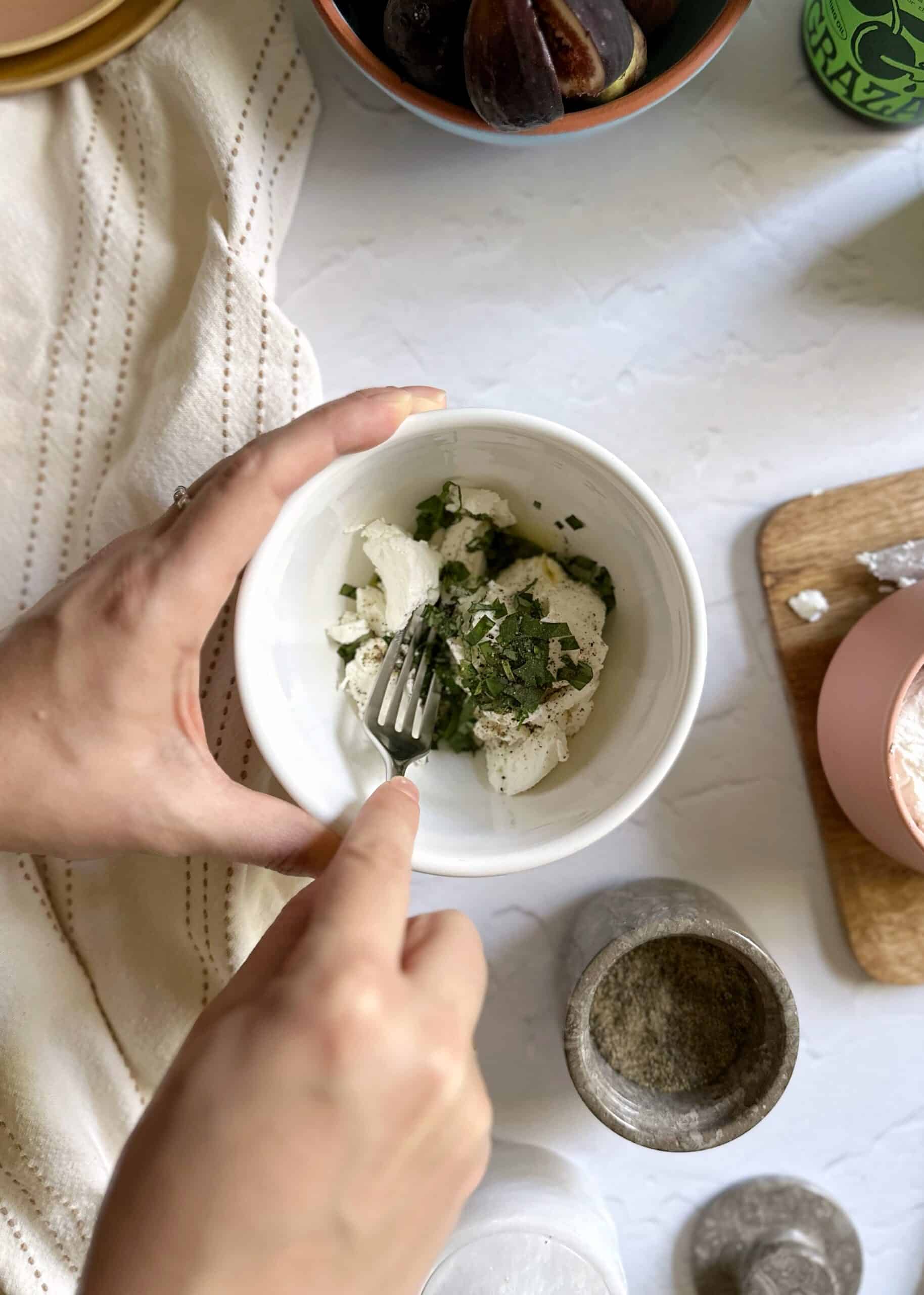 Next, make the goat cheese filling by crumbling the goat cheese into a mixing bowl. Add the fresh, chopped basil, a drizzle of olive oil, and a pinch of both salt and pepper. Use the back of a fork to mix and meld all of the ingredients together.