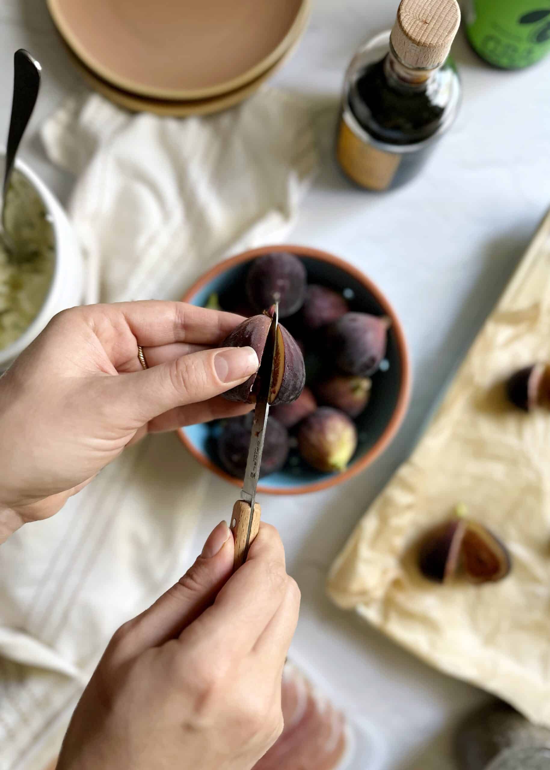 Slice the figs in half, up to the stem, leaving a small part combined near the top of the fruit.
