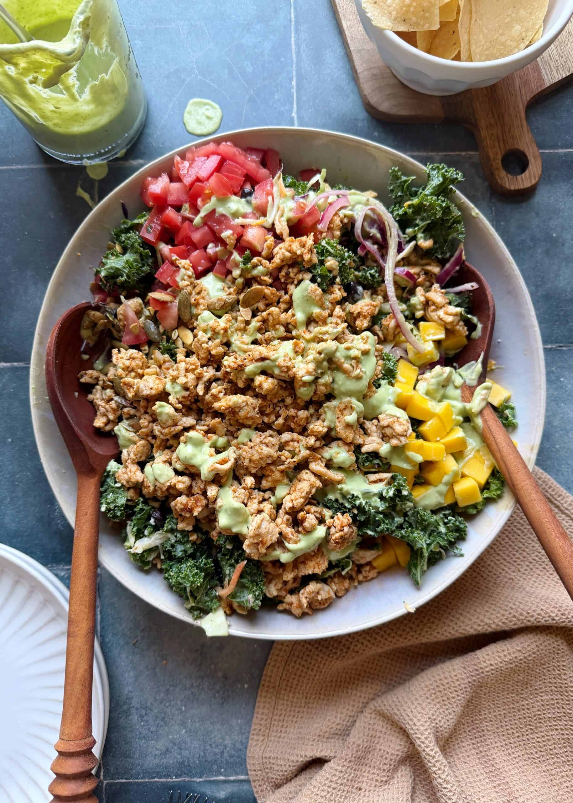To assemble the salad, add the chopped kale, shredded cabbage, and chopped fresh cilantro to a large salad bowl. Pour a third of the avocado greek yogurt dressing over the top and massage it into the greens. This will soften the kale and cabbage, making it nice and tender to eat.